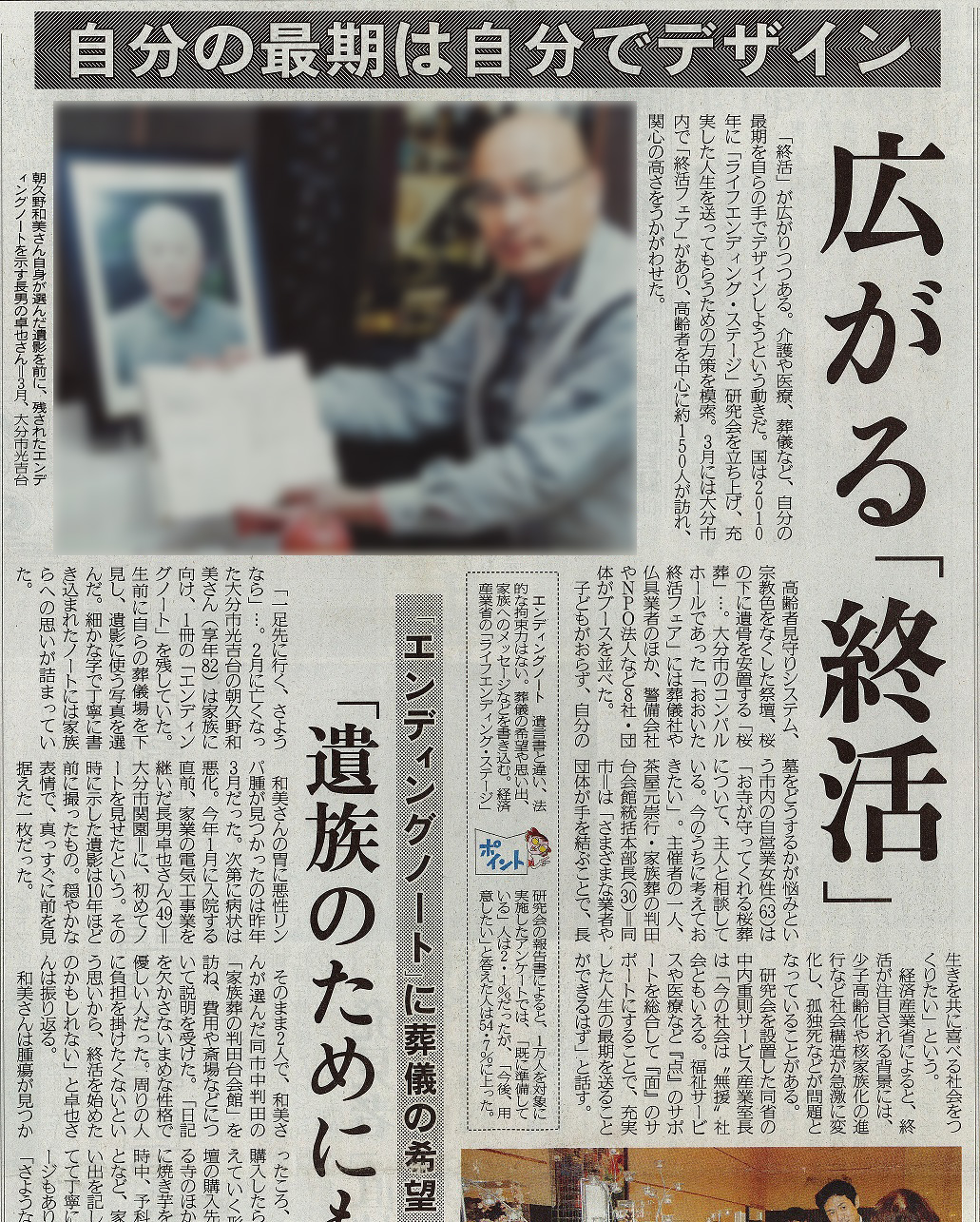 設立以来、大分で初めての家族葬専門葬儀社として、生活者ニーズにかなう葬祭サービスを提供していることが評価され、多くのメディアで取り上げていただいています。 また、終活フェアや終活セミナーの開催も様々な報道機関にご紹介いただきました。