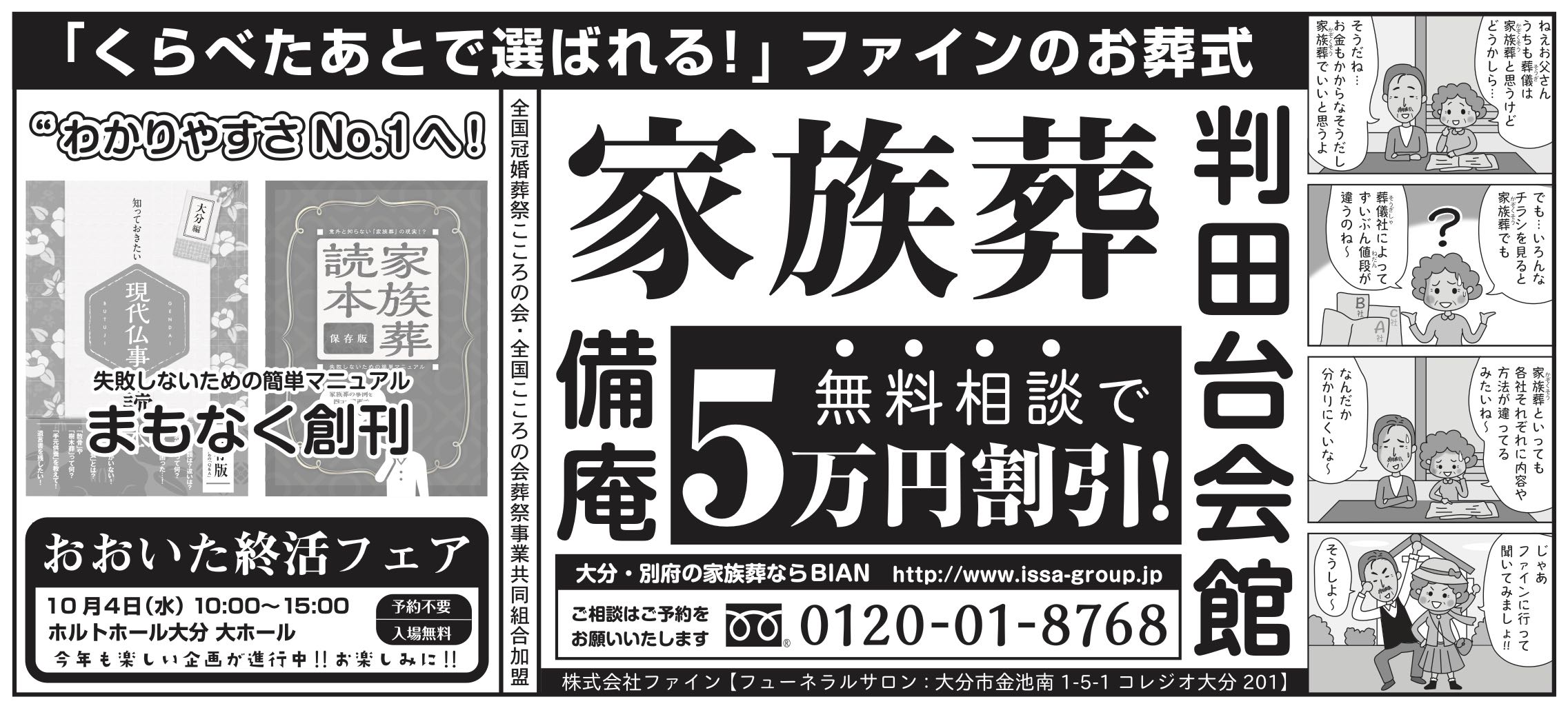 大分合同新聞のお葬式特集で掲載していただいた家族葬の判田台会館・備庵の広告です。