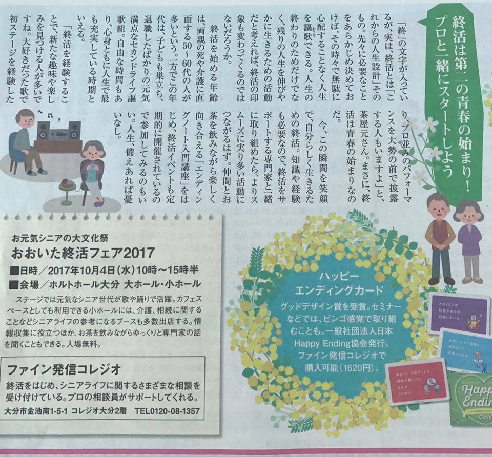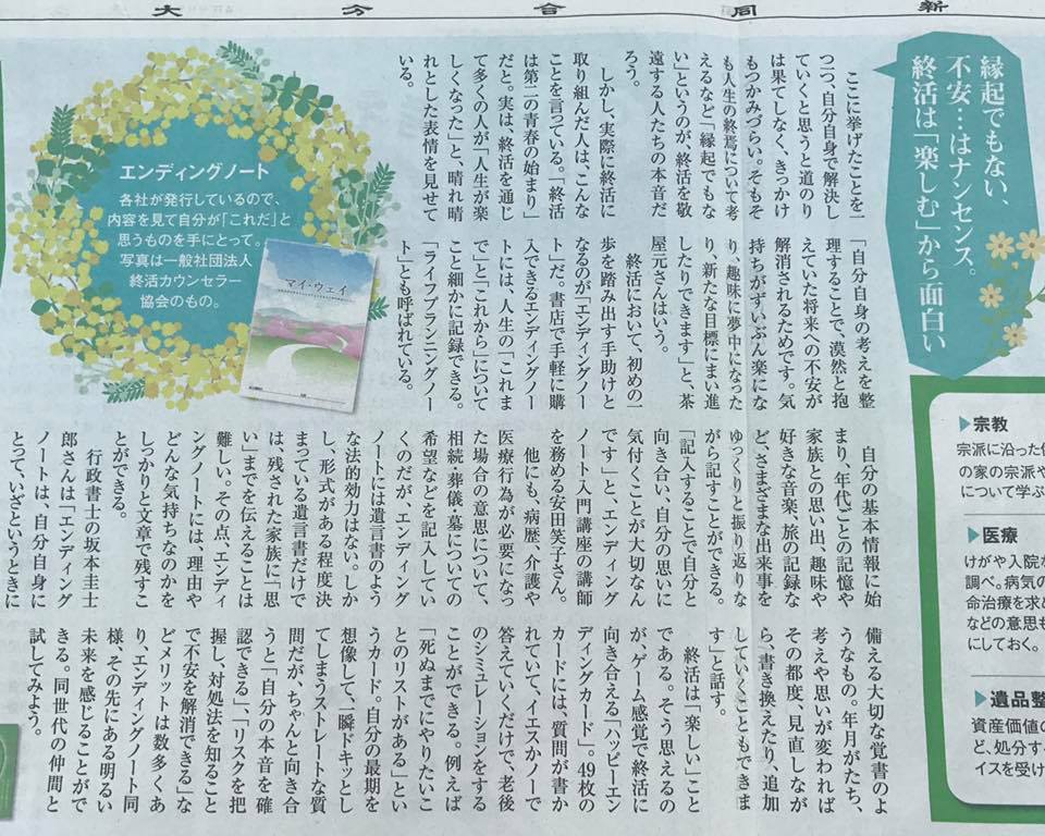 記事ではコレジオ大分で毎月開催しているエンディングノートの書き方講座やハッピーエンディングカードについてもご紹介いただいています。