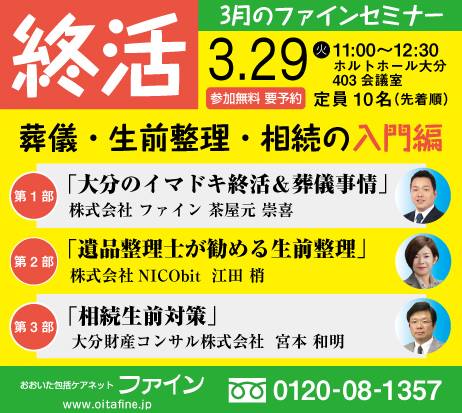 3月29日、大分市金池のホルトホール大分で行われる終活セミナーで株式会社ファインの茶屋元もお話しさせていただきます。